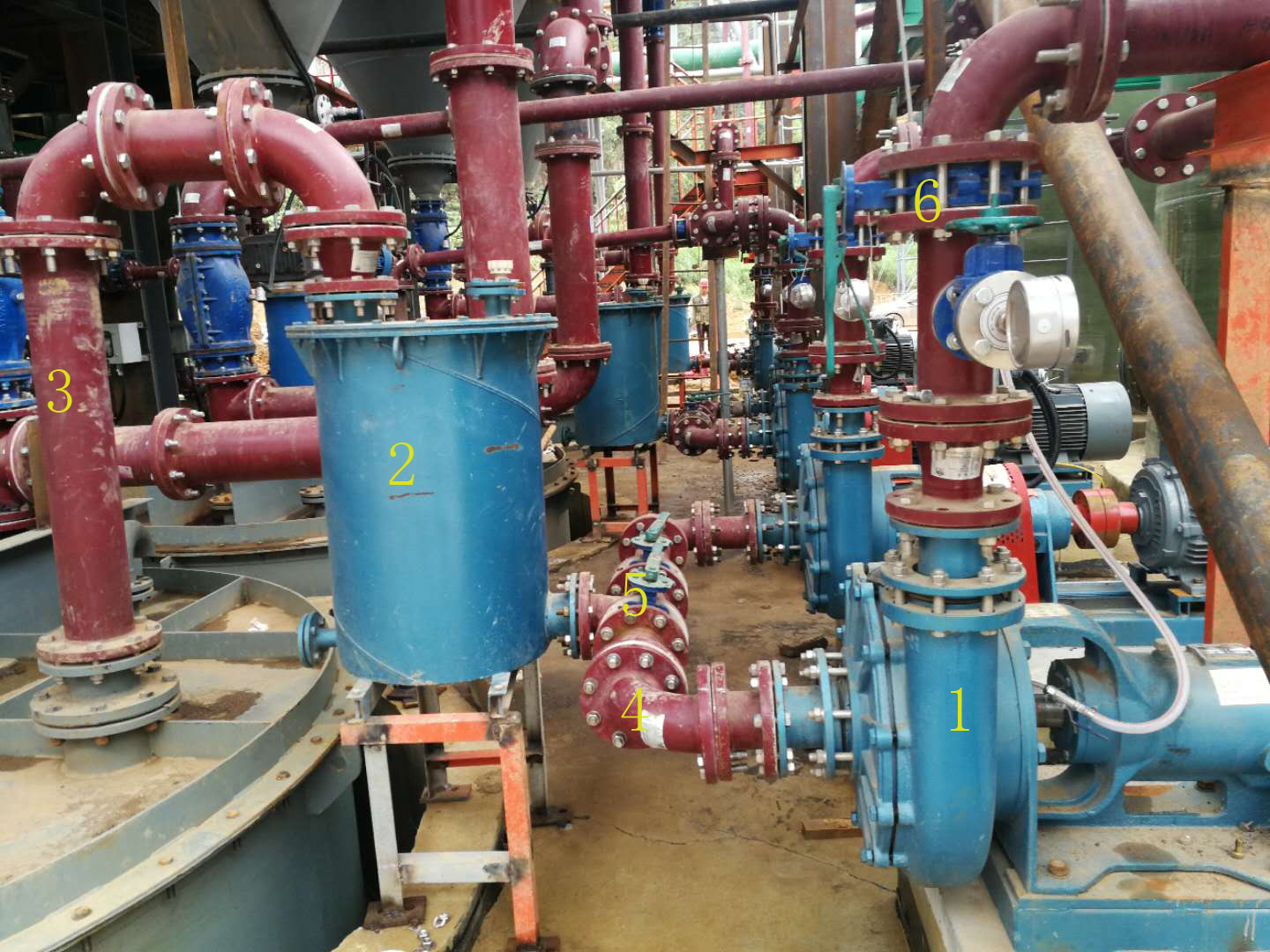 下圖管路布置較為合理,不合理之處在于兩臺泵共用虹吸桶,已出現(xiàn)過因閥門關(guān)不嚴(yán)而損壞耐腐耐磨泵的情況。