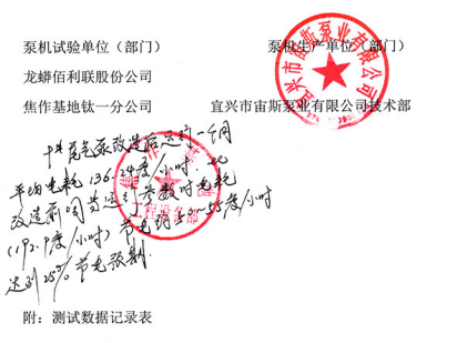 一、評(píng)價(jià)意見(jiàn):該泵在龍蟒佰利聯(lián)基地的尾氣脫硫崗位上,經(jīng)2018年10月起連續(xù)運(yùn)行試驗(yàn)表明,改良后的該型防腐離心泵與未改良前比較,在提高了流量、揚(yáng)程的條件下,在工藝條件沒(méi)有變化的情況下,有明顯的節(jié)電節(jié)能效果,能節(jié)能25%左右(詳見(jiàn)測(cè)試記錄表)。