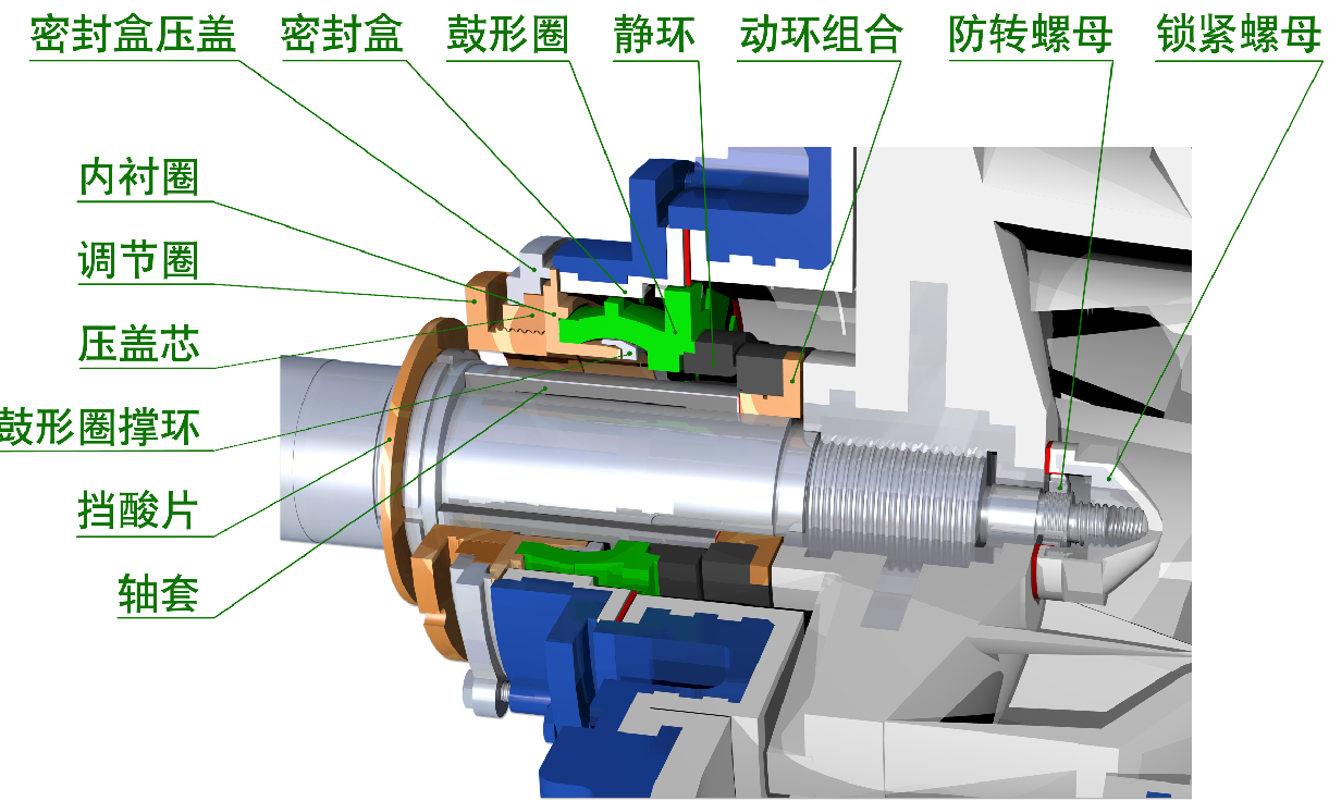 該密封主要結(jié)構(gòu)是在密封盒腔體中設(shè)置一個(gè)球形橡膠彈性圈(鼓形圈),頂推壓緊動(dòng)靜環(huán),鼓形圈外側(cè)的腔體和泵腔內(nèi)的液體相通,起到傳遞流體壓力和內(nèi)冷卻的作用。該密封是結(jié)構(gòu)簡(jiǎn)單、工作原理科學(xué)、功能完備的組合式密封,適用于輸送含固量在20%以?xún)?nèi)的腐蝕性料漿或清液介質(zhì)。注意:該密封不推薦用于吸上工況(液位低于泵進(jìn)口),否則可能因?yàn)樨?fù)壓過(guò)大無(wú)法吸上!