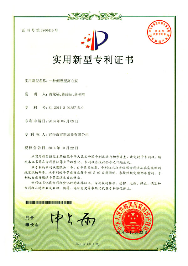 實用新型專利:一種側(cè)吸型離心泵